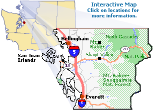 Bellingham area - Whether you're looking for picturesque lakes and rivers, challenging hikes, bald eagle watching, sweeping views of Mt. Baker, scenic drives along Puget Sound and the Cascades, or charming cities and town...this area of Washington is beautiful from every angle. Bellingham also serves as a gateway to Vancouver, British Columbia, site of the 2010 Olympics.